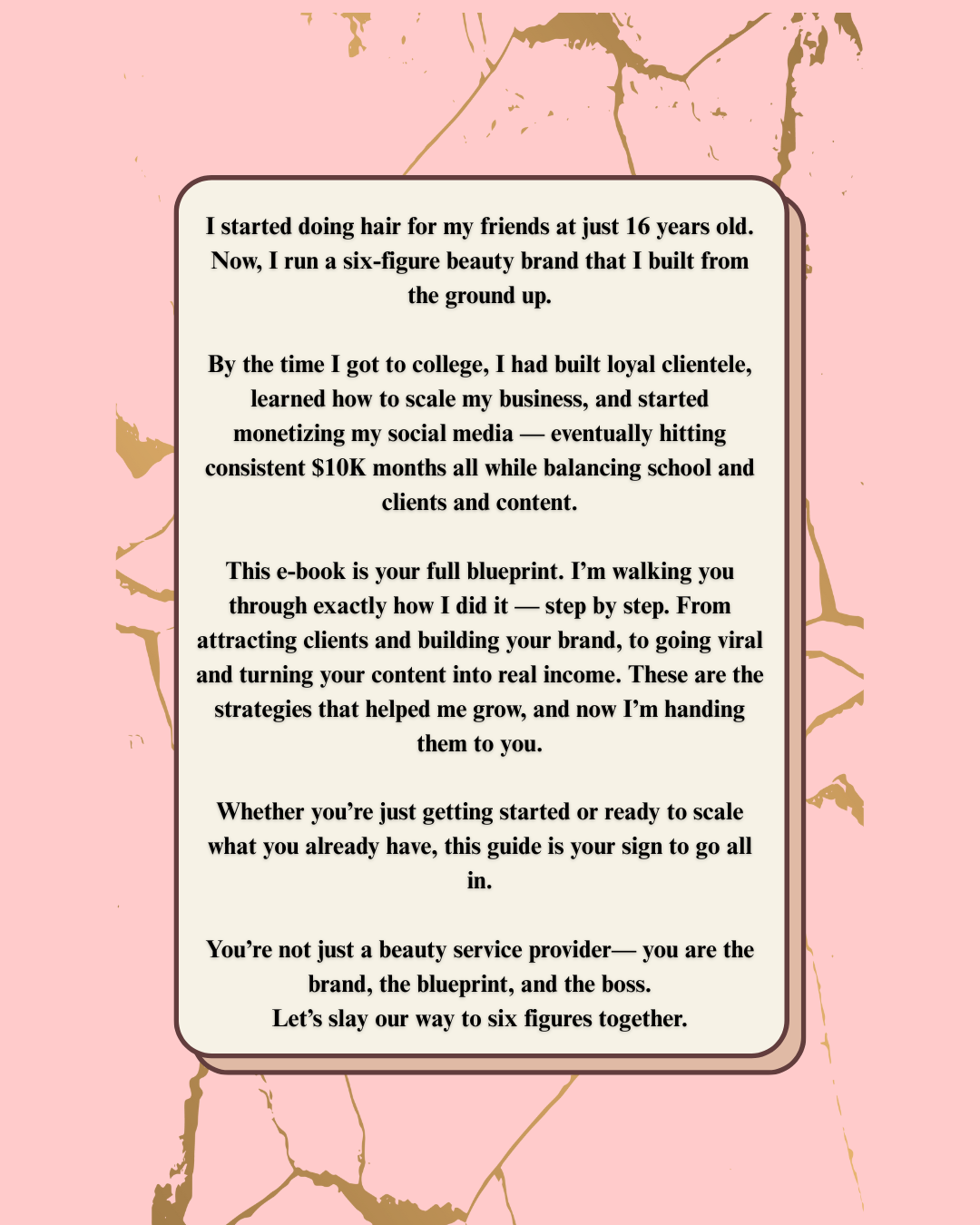This digital guide is your full blueprint to scaling your beauty business with purpose and profit — by following my strategy you are taking the first steps to increasing and maintaining clientele, turning your business into a brand, and making passive income off of your skills with content creation.